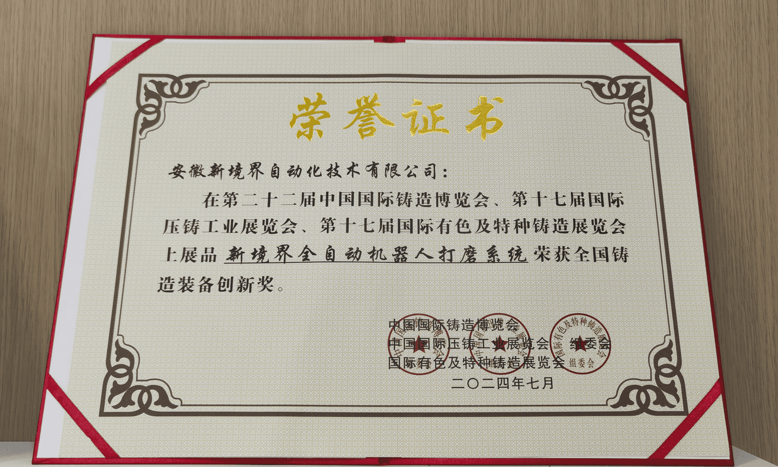 7月4日,備受矚目的第二十二屆中國國際鑄造博覽會盛大開幕,吸引了來自世界各地的鑄造企業和行業精英齊聚一堂,共同探討鑄造行業的新趨勢、新技術和新應用。 新境界作為國內智能打磨領域的領軍企業,積極參與了此次展會,憑借卓越的品牌影響力和技術實力,展會期間,新境界的展位吸引了眾多專業觀眾的目光,現場氣氛熱烈非凡,人流如織,是本次展會人氣最旺的展臺之一。 下面,讓我們一起直擊現場,一覽精彩內容: (中國鑄造協會常務副會長張志勇蒞臨我司展位) (中國鑄造協會常務副會長張志勇蒞臨我司展位) 本次展會期間,新境界再次憑借行業領先的產品技術水準,榮獲中國鑄造協會頒發的“全國鑄造裝備創新獎”。本次獲獎的全自動機器人打磨系統憑借其高精度、高剛性、高穩定性等優秀性能,在業界廣受好評,這不僅是對新境界技術實力的肯定,更是對中國鑄造業自主創新能力的認可。 新境界一直致力于技術創新和產品質量提升,未來新境界將繼續秉承“精益求精”的信念,不斷推動技術進步和產品升級,為中國鑄造后處理行業的繁榮發展,貢獻更多力量。 暫別申城、相約天津! 期待,期待下一次相聚! 相聚,無論春暖秋涼,無論盛夏寒冬! 2025年5月18-21日,天津,再相聚!