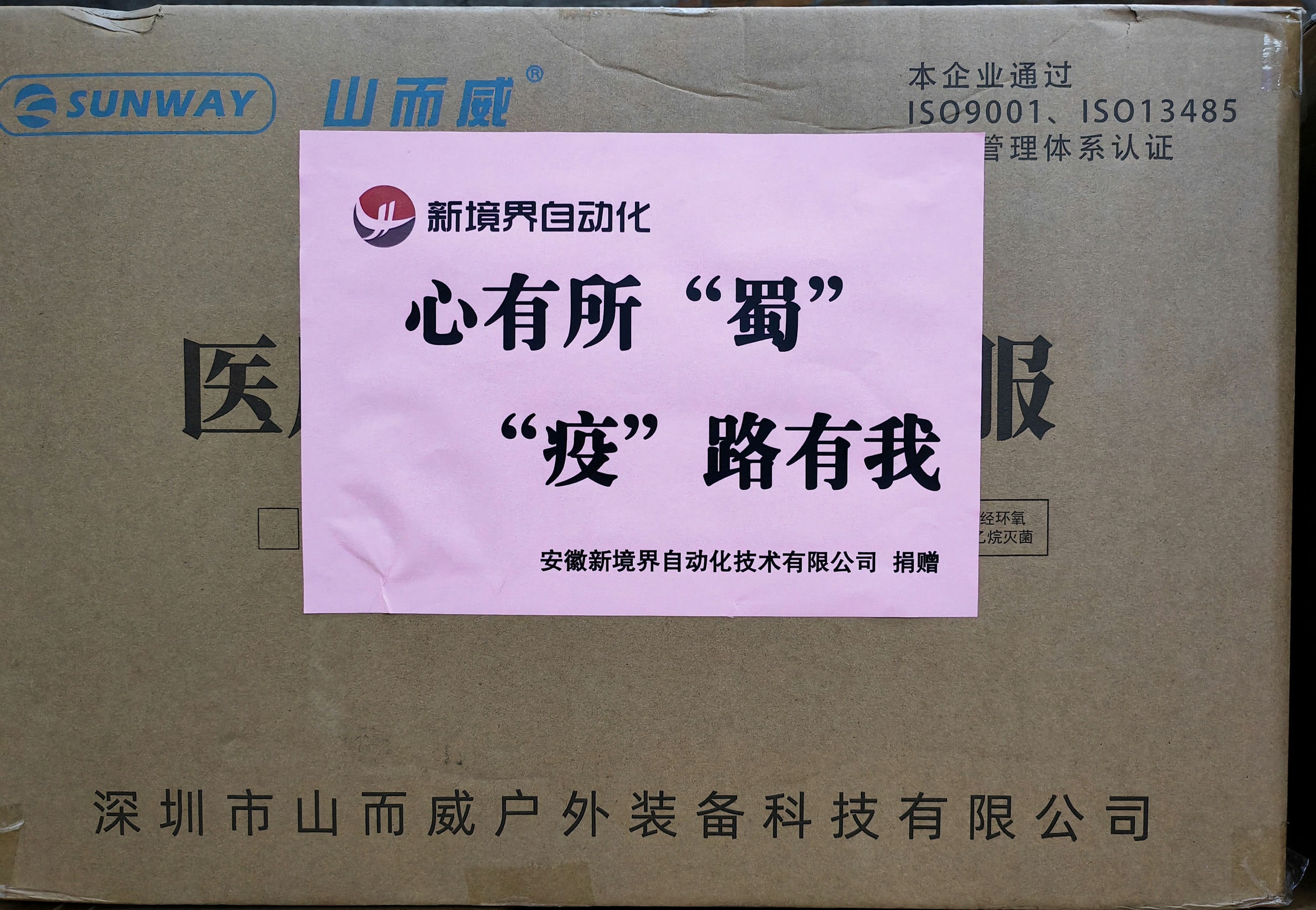 安徽新境界自動化技術有限公司作為蜀山區企業,主動扛起社會責任擔當,向沖鋒在防疫一線的同志致以崇高敬意的同時,用自己力所能及的方式誠獻一份力。公司采購捐獻500套醫用防護服、3360個醫用N95口罩,助力疫情防控第一線。