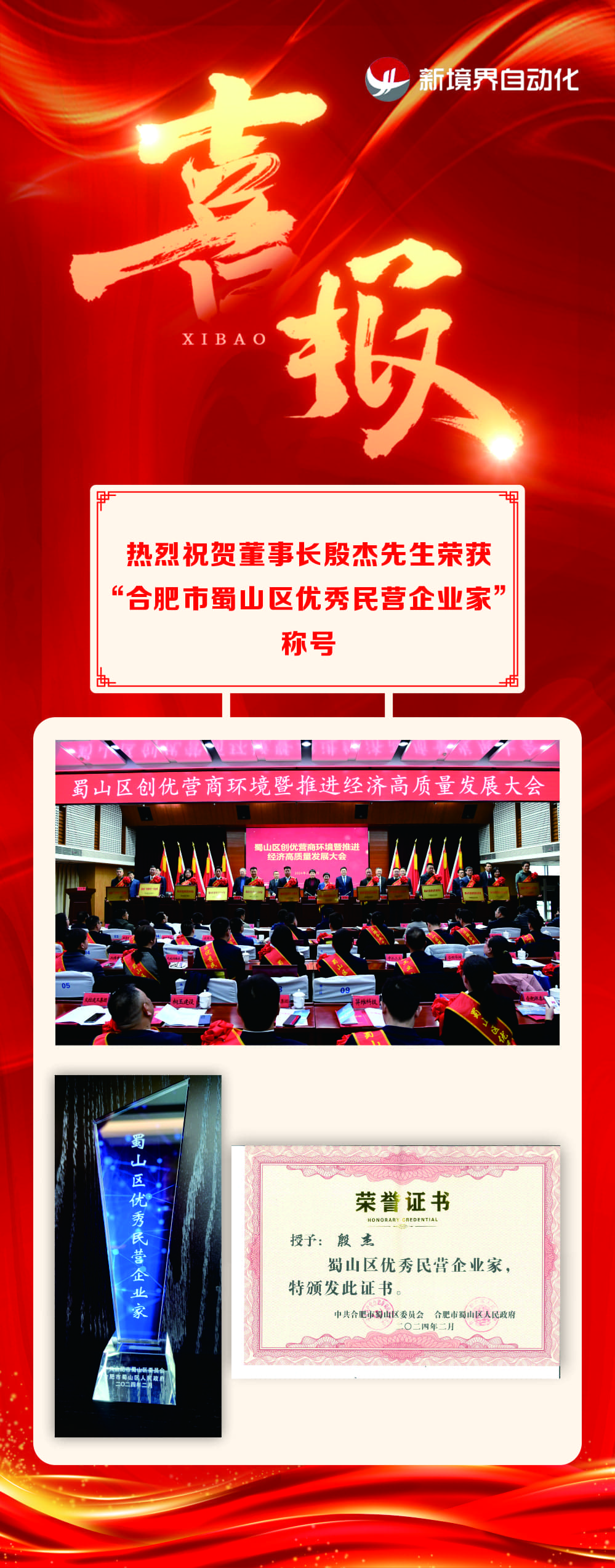 熱烈祝賀董事長殷杰先生榮獲“合肥市蜀山區優秀民營企業家”稱號